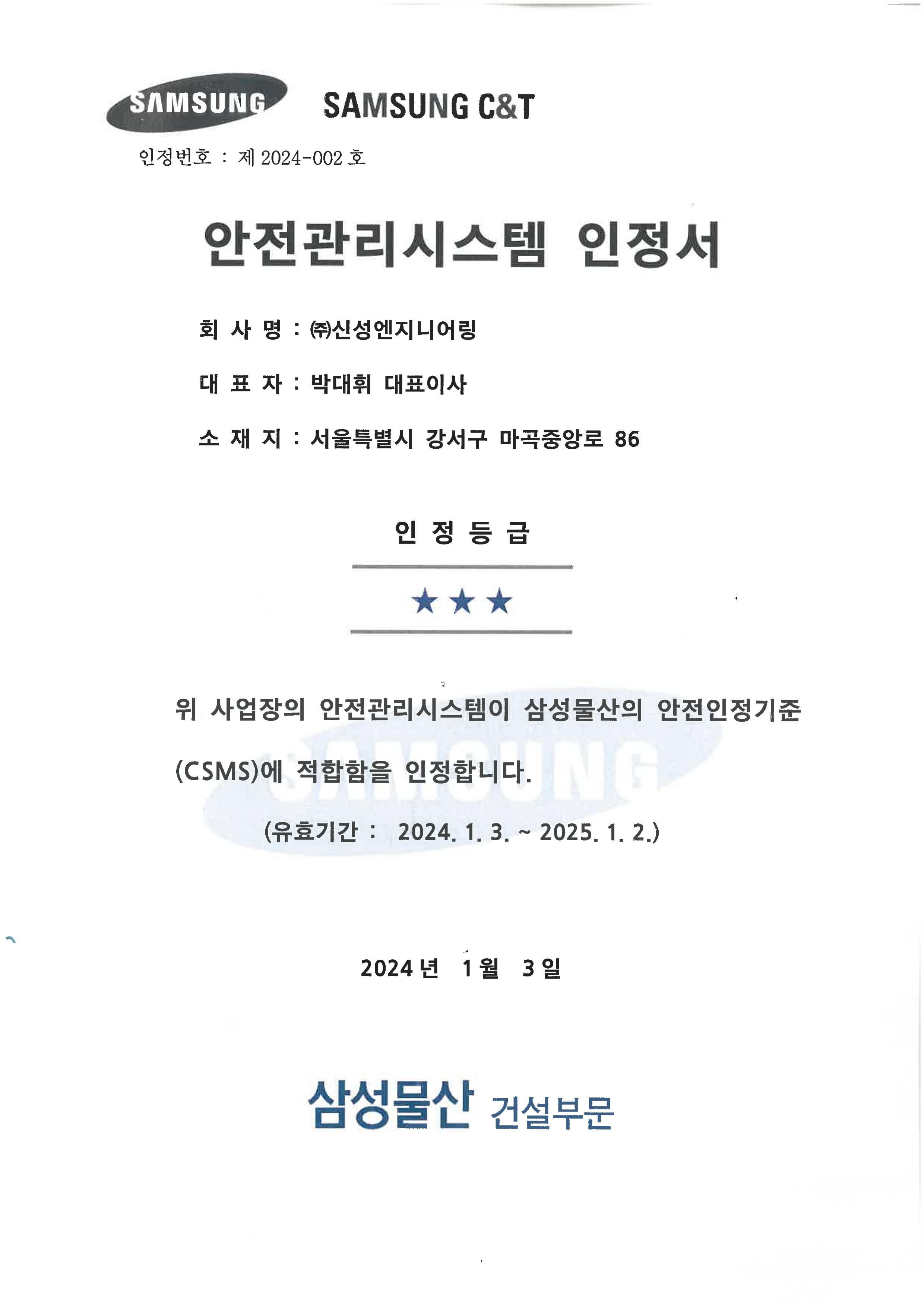 신성엔지니어링, 2024년 삼성물산 건설부문 안전인정기준 3star 획득